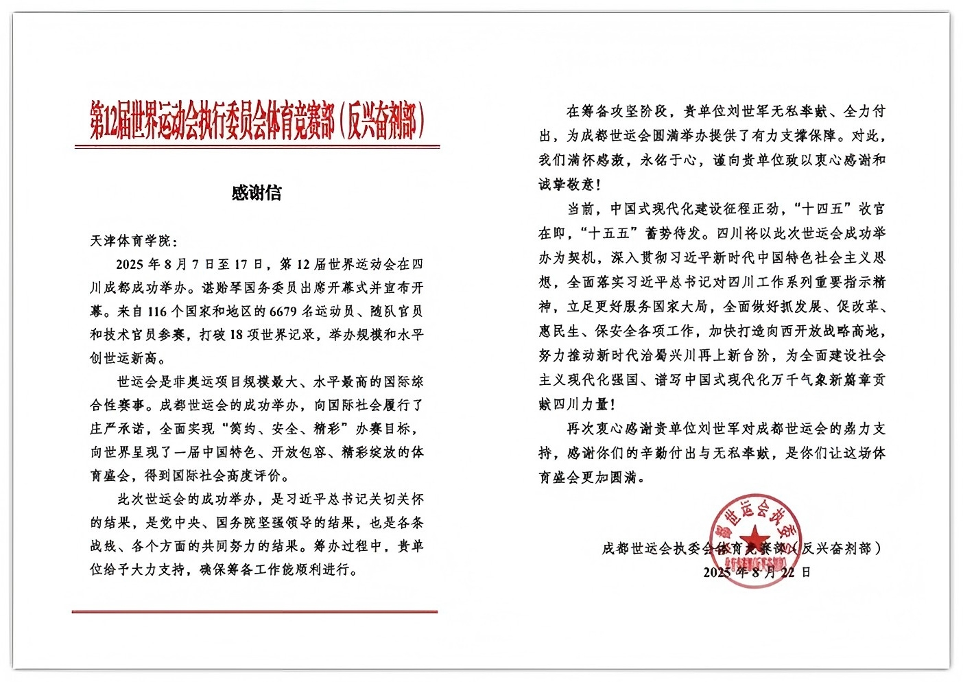 近日,第12届世界运动会执行委员会体育竞赛部(反兴奋剂部)给最新足球赛果 发来感谢信,对最新足球赛果 在世运会筹办过程中给予大力支持,确保筹备工作顺利进行表示感谢,对最新足球赛果 竞技运动最快足球比分网 院长刘世军在筹备攻坚阶段的无私奉献、全力付出表示感谢。